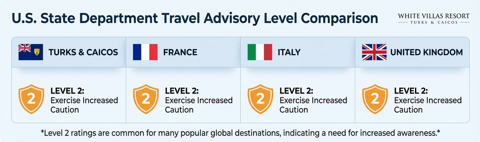 When you search for safety information, you will likely see a travel advisory from the U.S. State Department. Currently, Turks and Caicos is listed as a Level 2 destination. This tells travelers to exercise increased caution.