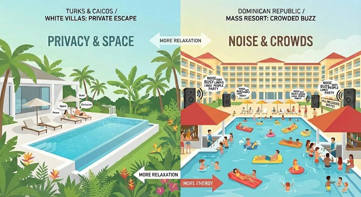 💡 Insight: Did you know the Dominican Republic is a large nation with mountains and cities, while Turks and Caicos is a small chain of low-lying coral islands? This gives TCI its famous shallow, bright blue water.