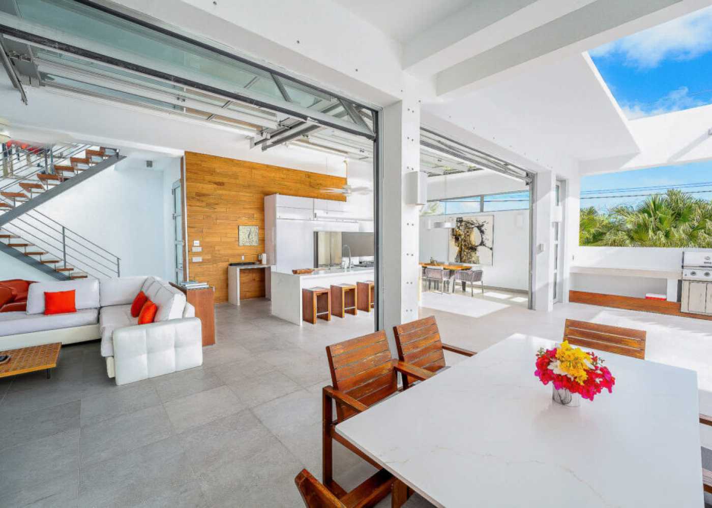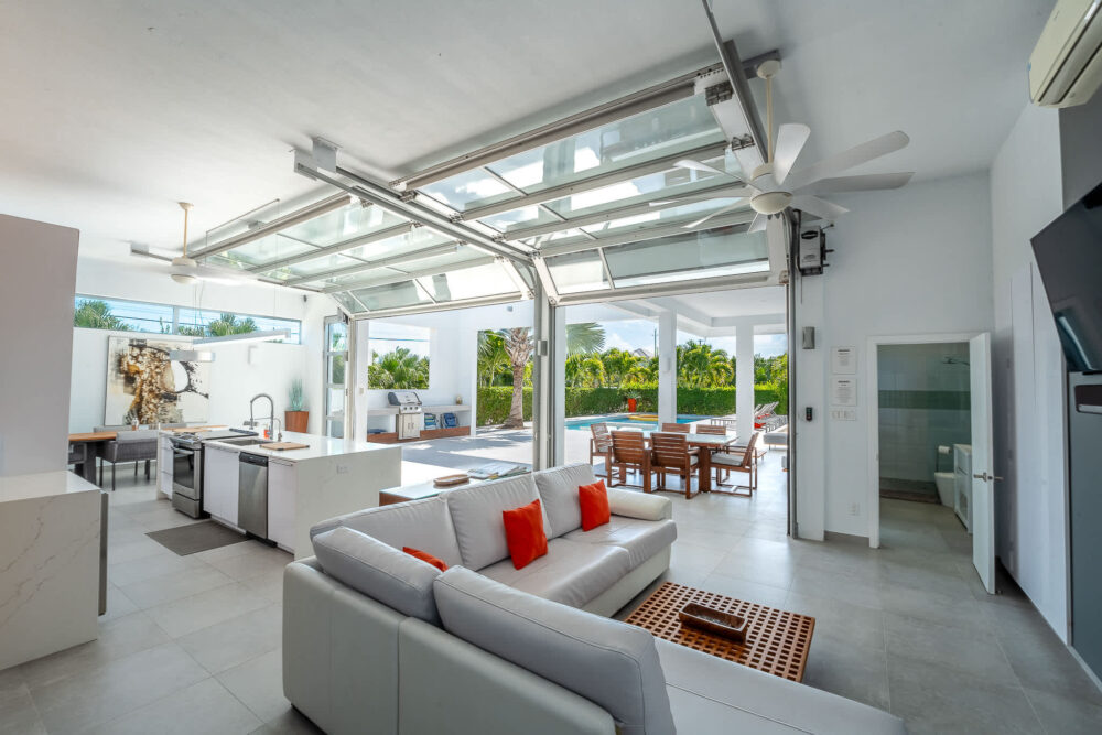 One of the villa’s most unique architectural features is its custom-designed garage-style glass doors. These doors open completely with no track on the floor, creating a true indoor-outdoor living experience. It's a seamless transition from your living room to the pool terrace — making the entire space feel expansive and perfectly integrated with nature. This feature is one-of-a-kind on the island, and it’s one that guests often mention as a highlight of their stay.