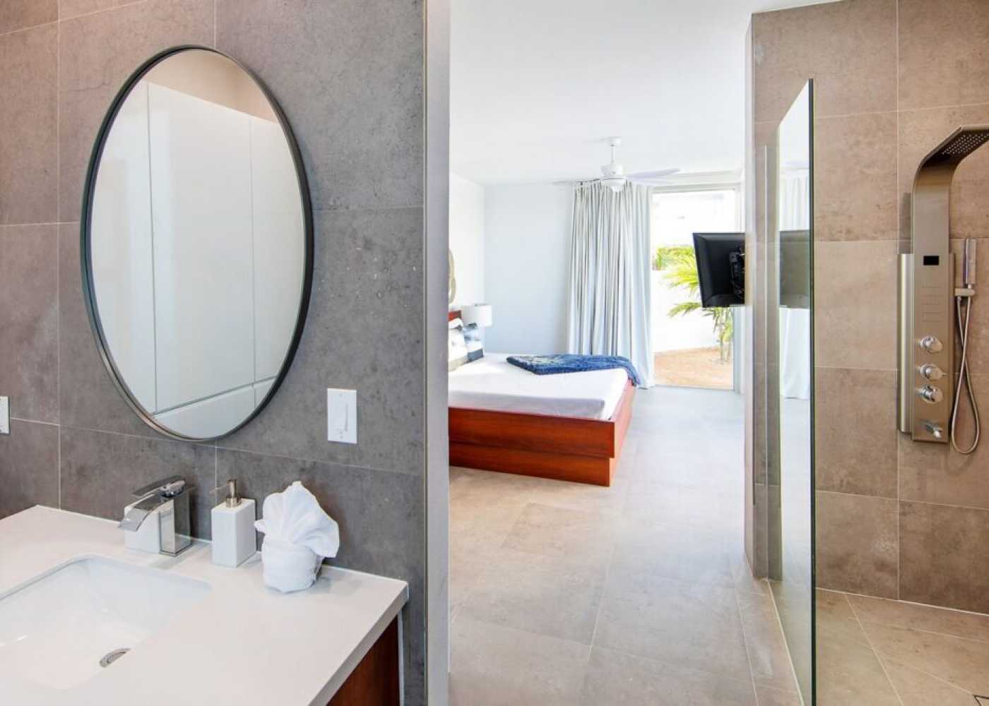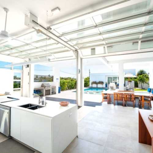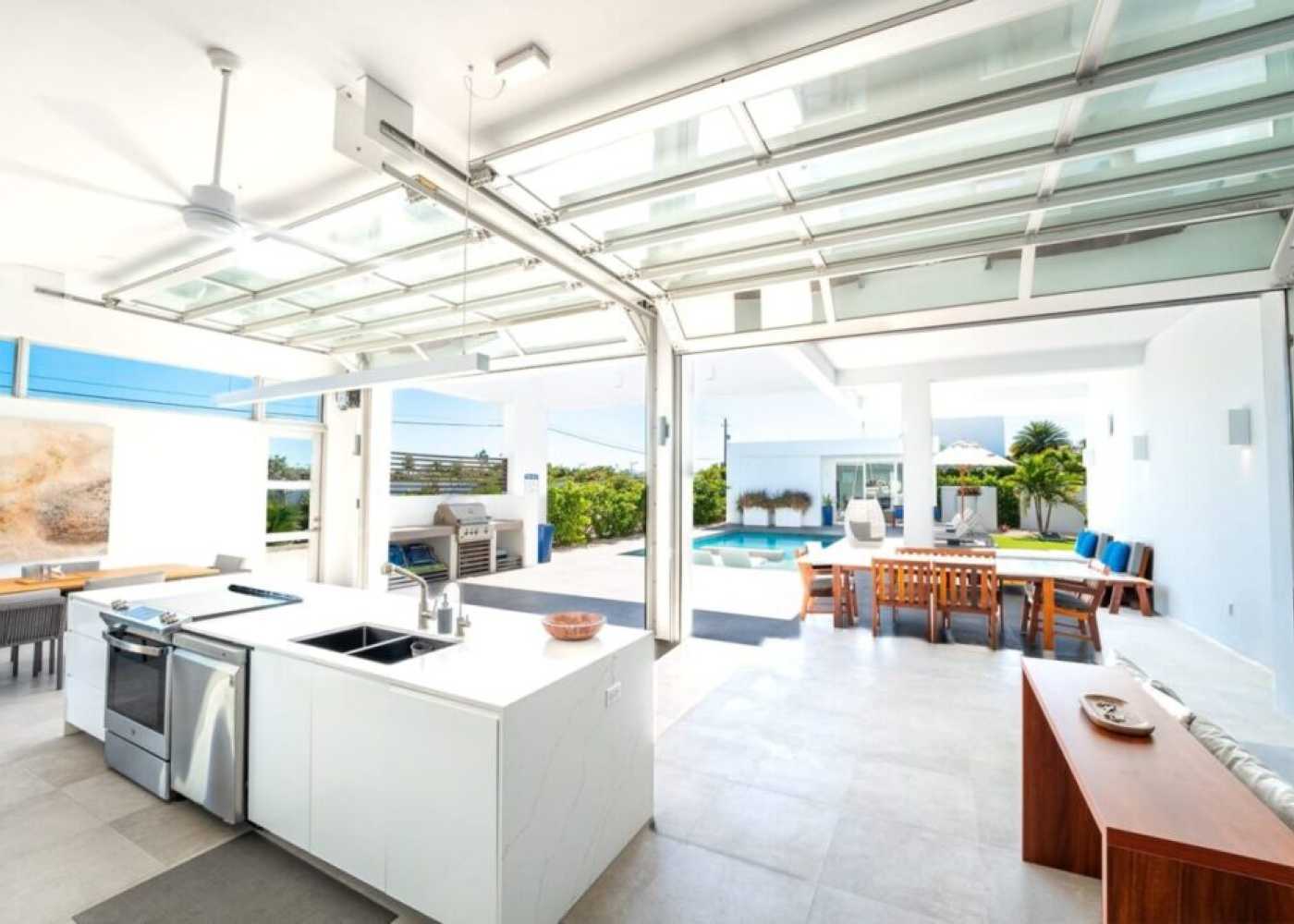 One of the villa’s most unique architectural features is its custom-designed garage-style glass doors. These doors open completely with no track on the floor, creating a true indoor-outdoor living experience. It's a seamless transition from your living room to the pool terrace — making the entire space feel expansive and perfectly integrated with nature. This feature is one-of-a-kind on the island, and it’s one that guests often mention as a highlight of their stay.