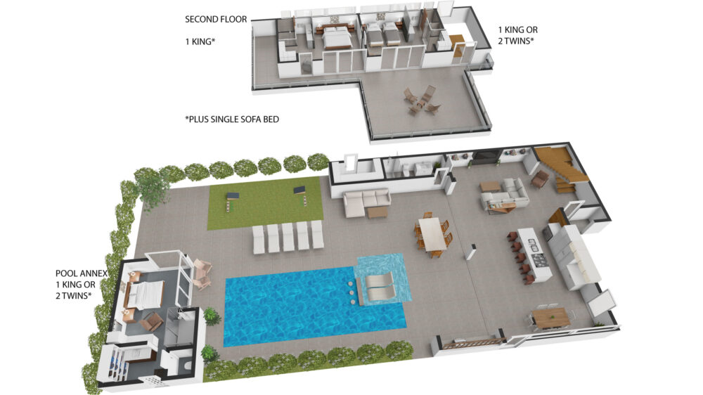 - Bedroom 3 (pool annex) : 2 twins or 1 king
