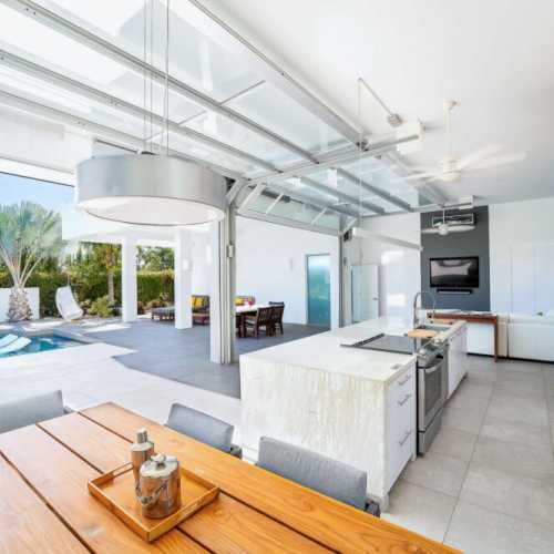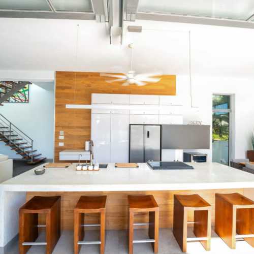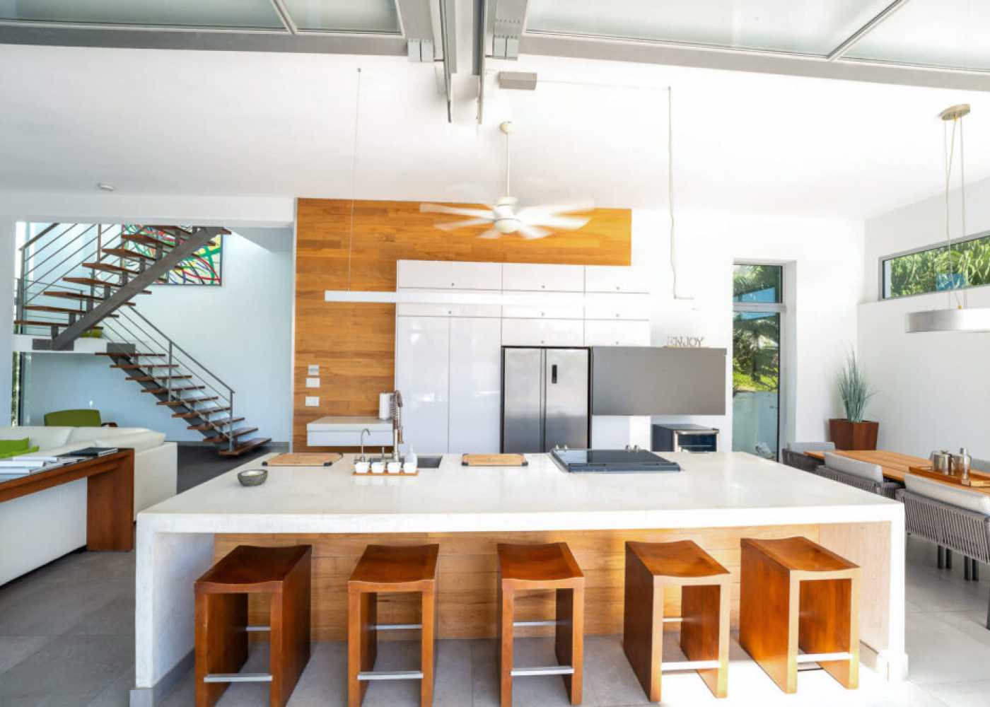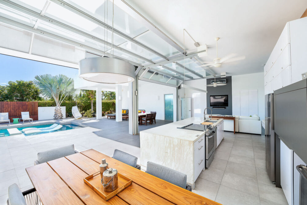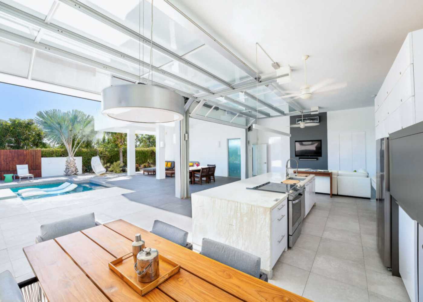 One of the villa’s most unique architectural features is its custom-designed garage-style glass doors. These doors open completely with no track on the floor, creating a true indoor-outdoor living experience. It's a seamless transition from your living room to the pool terrace — making the entire space feel expansive and perfectly integrated with nature. This feature is one-of-a-kind on the island, and it’s one that guests often mention as a highlight of their stay.