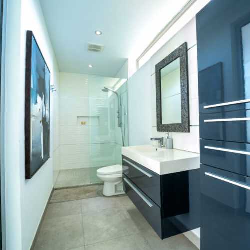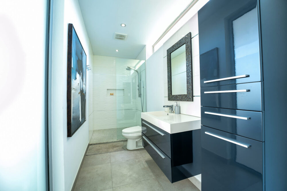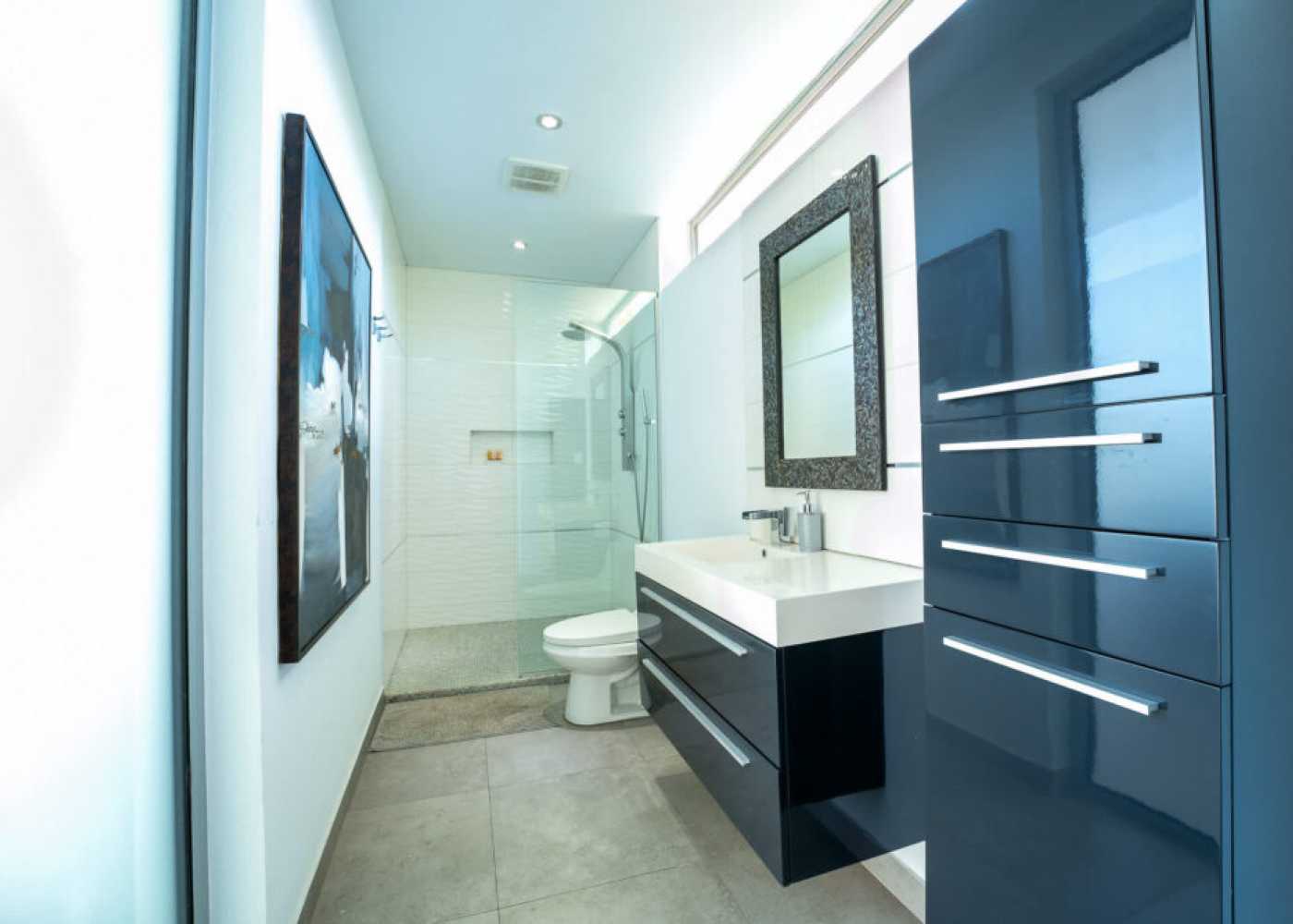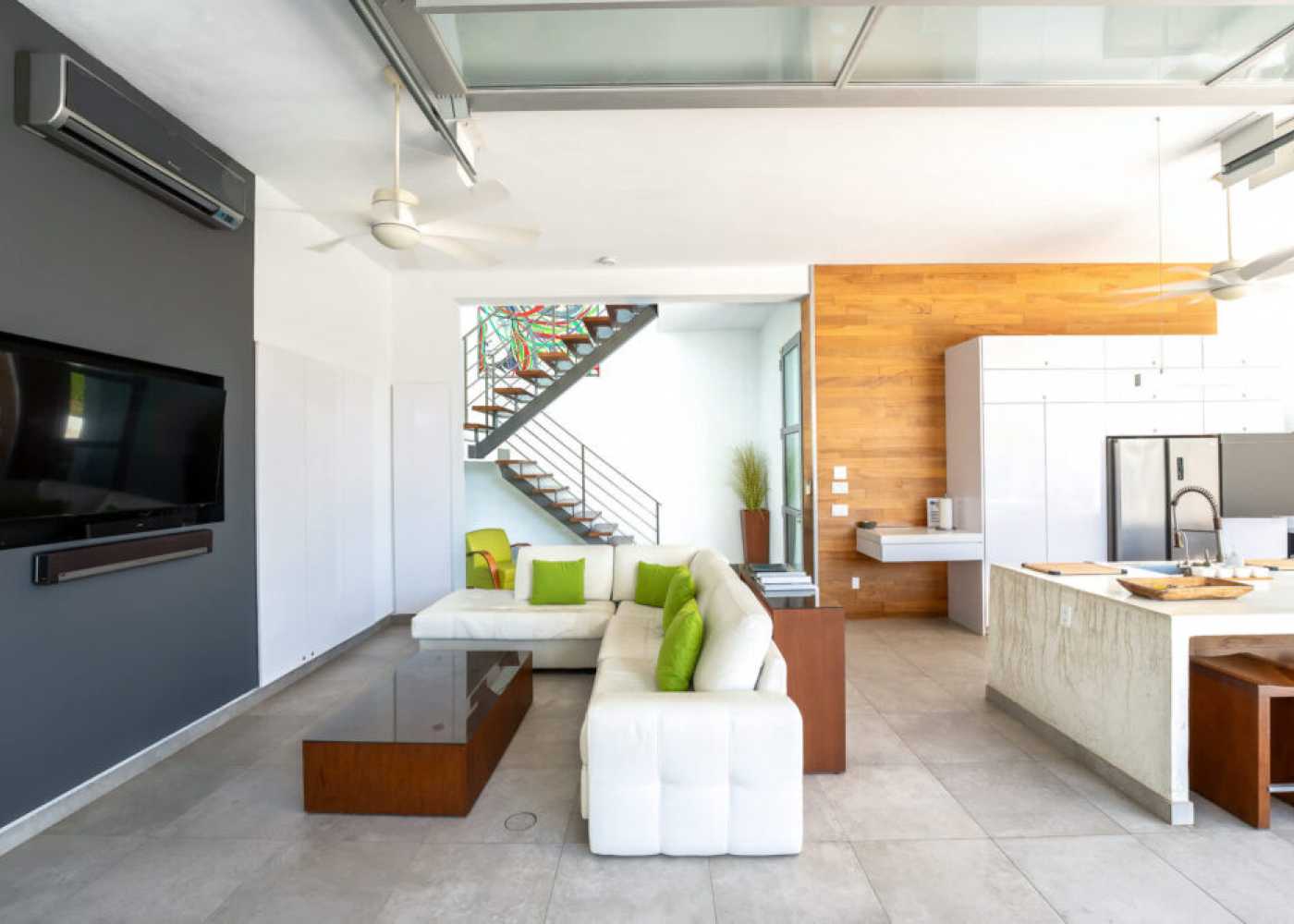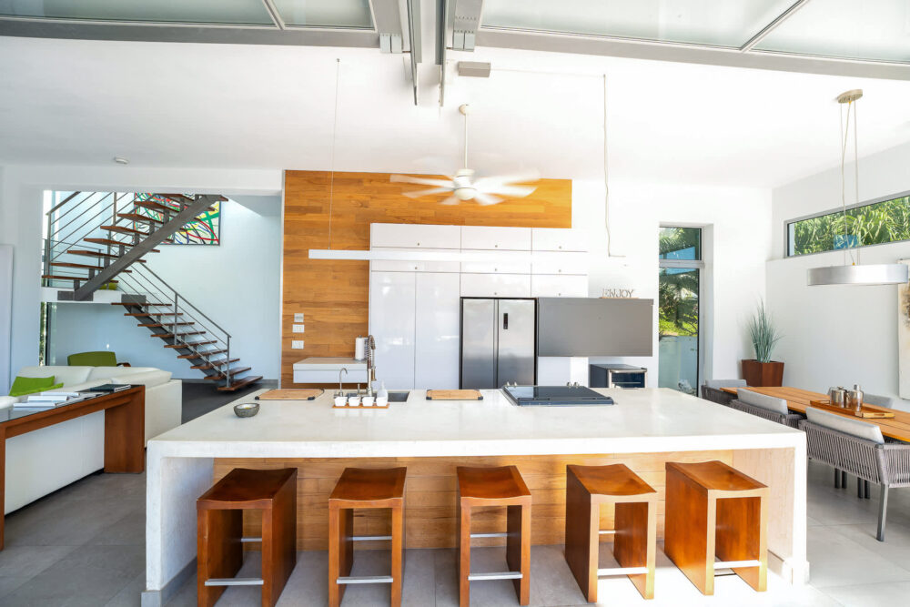 One of the villa’s most unique architectural features is its custom-designed garage-style glass doors. These doors open completely with no track on the floor, creating a true indoor-outdoor living experience. It's a seamless transition from your living room to the pool terrace — making the entire space feel expansive and perfectly integrated with nature. This feature is one-of-a-kind on the island, and it’s one that guests often mention as a highlight of their stay.