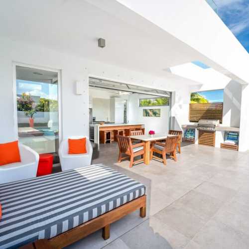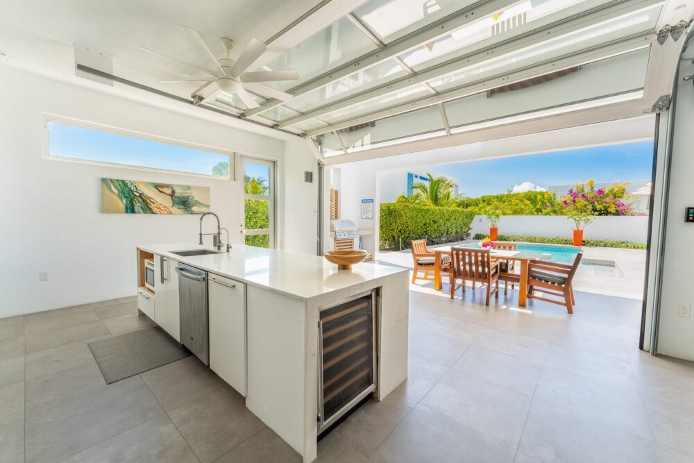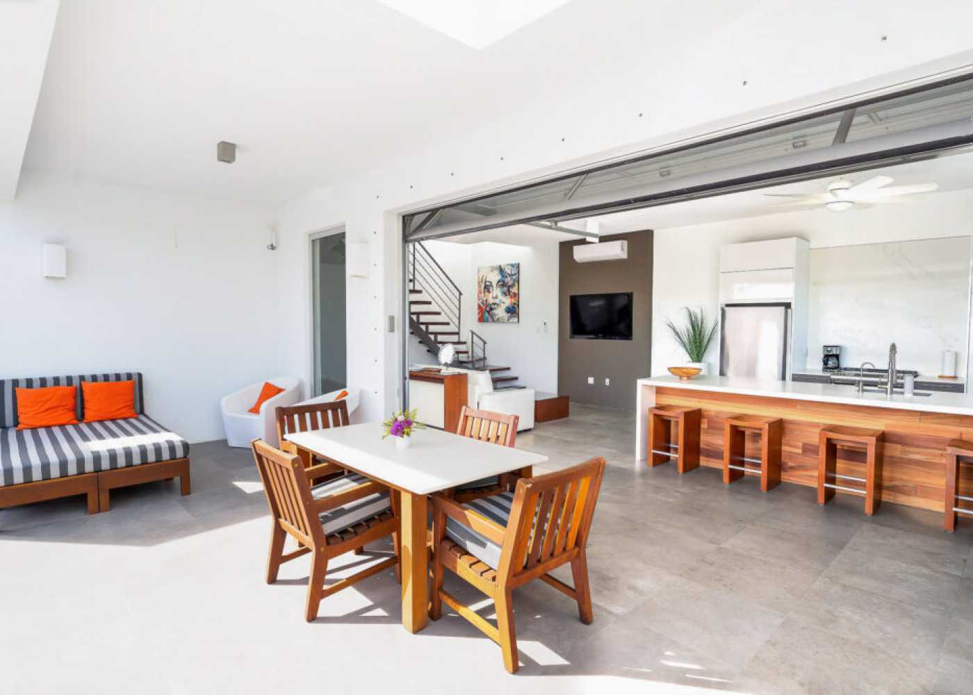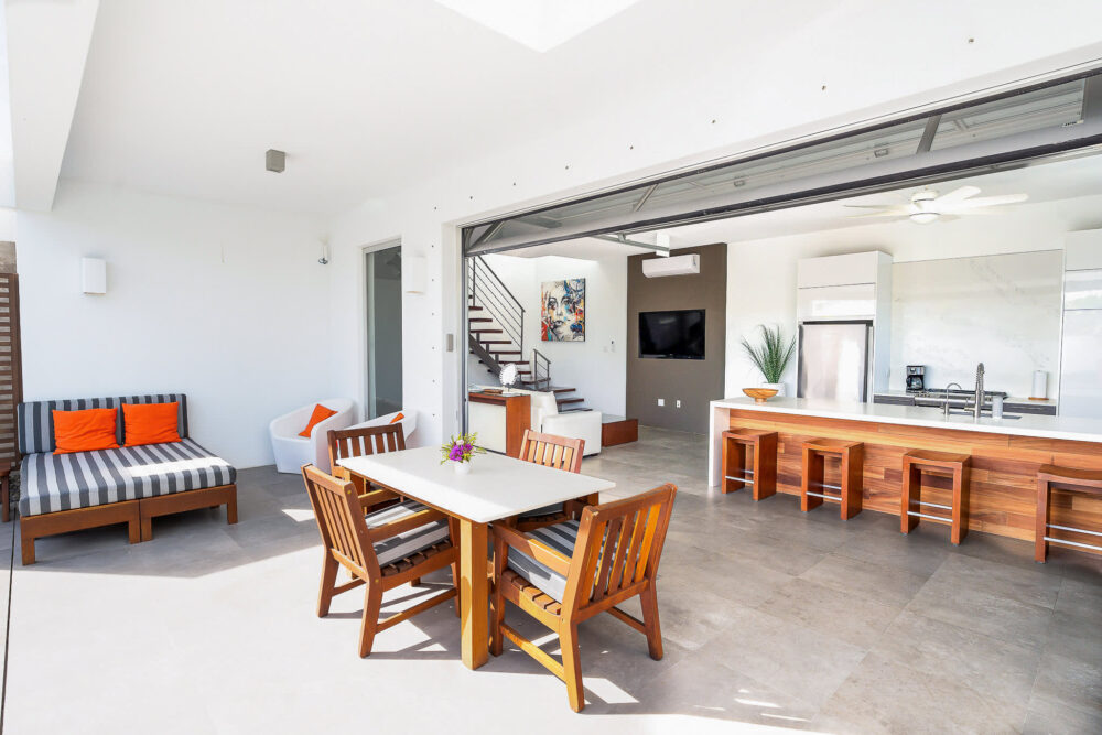 One of the villa’s most unique architectural features is its custom-designed garage-style glass doors. These doors open completely with no track on the floor, creating a true indoor-outdoor living experience. It's a seamless transition from your living room to the pool terrace — making the entire space feel expansive and perfectly integrated with nature. This feature is one-of-a-kind on the island, and it’s one that guests often mention as a highlight of their stay.