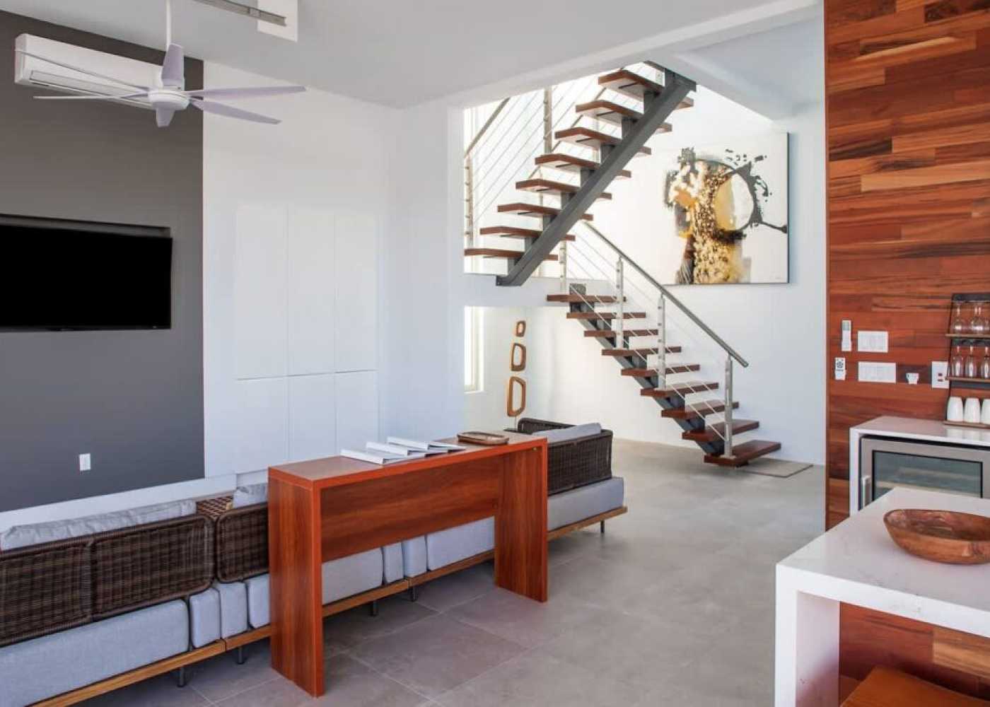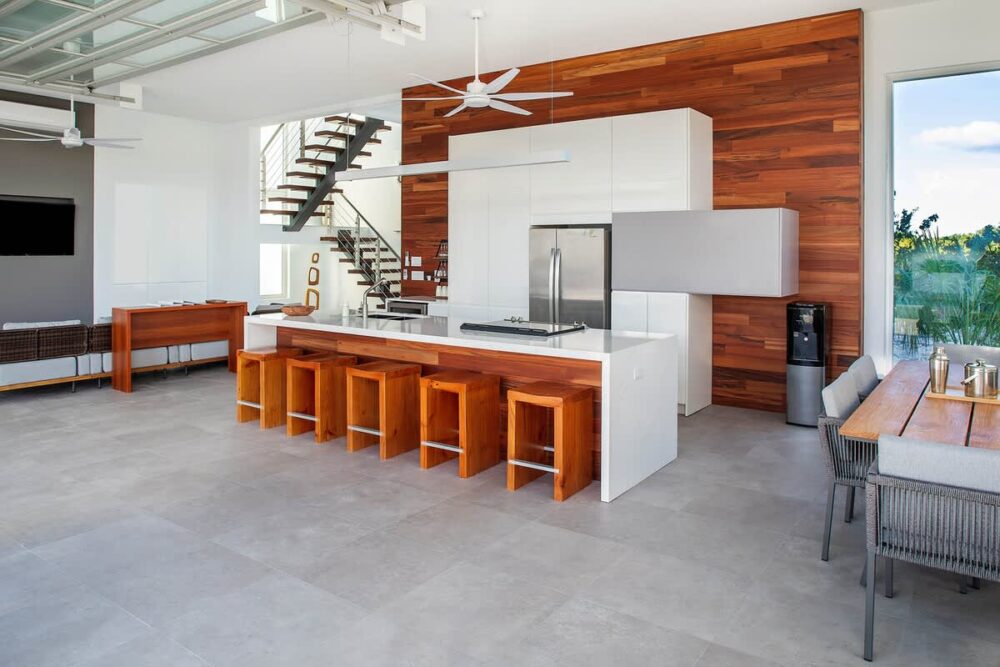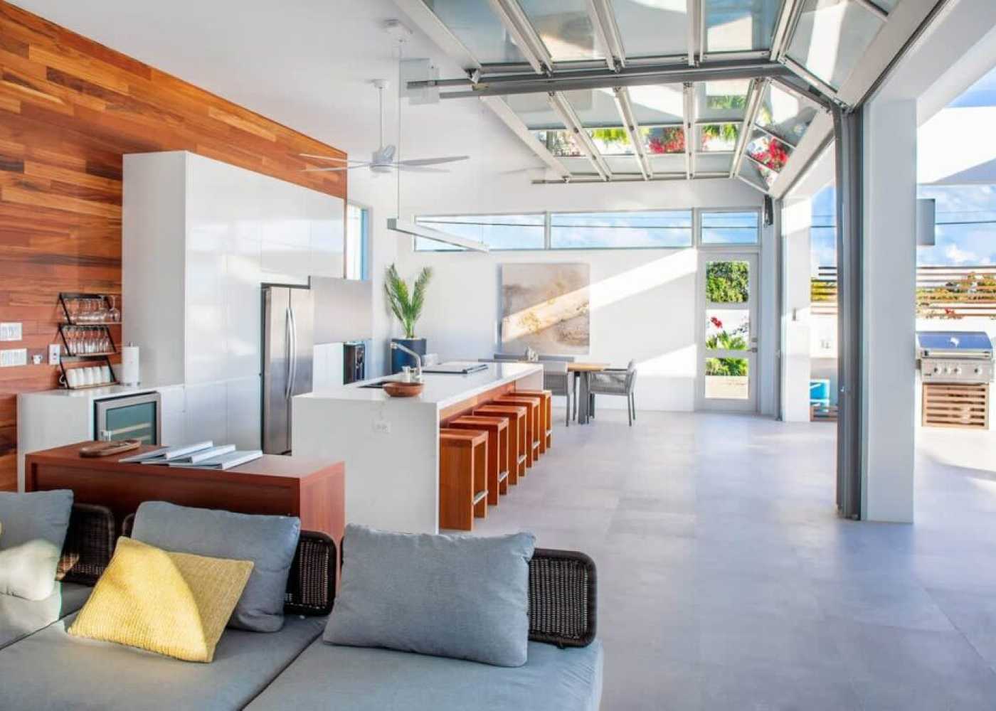 One of the villa’s most unique architectural features is its custom-designed garage-style glass doors. These doors open completely with no track on the floor, creating a true indoor-outdoor living experience. It's a seamless transition from your living room to the pool terrace — making the entire space feel expansive and perfectly integrated with nature. This feature is one-of-a-kind on the island, and it’s one that guests often mention as a highlight of their stay.