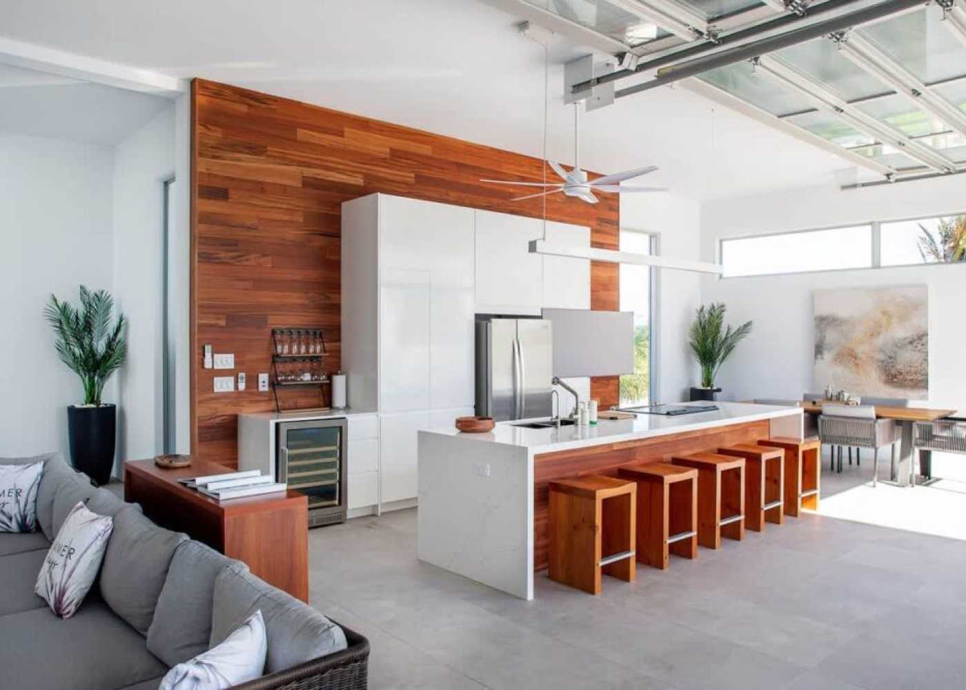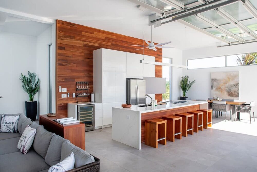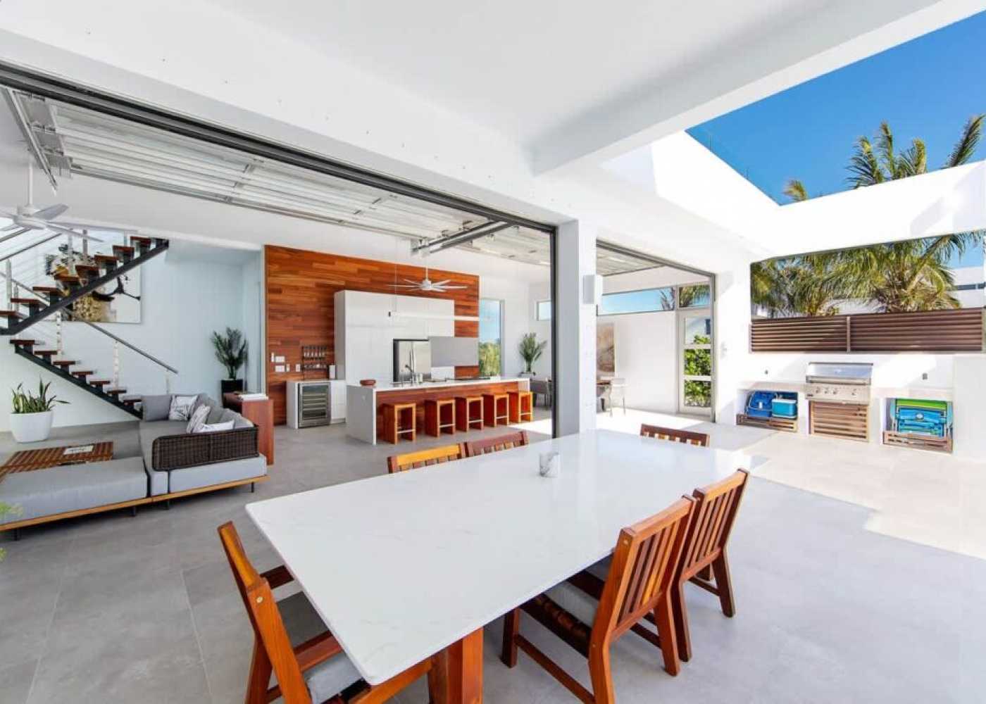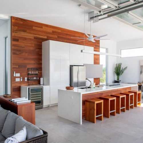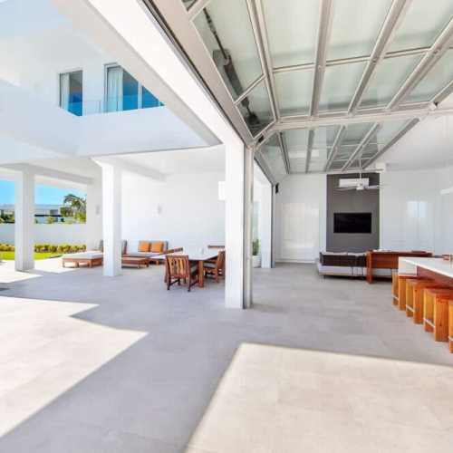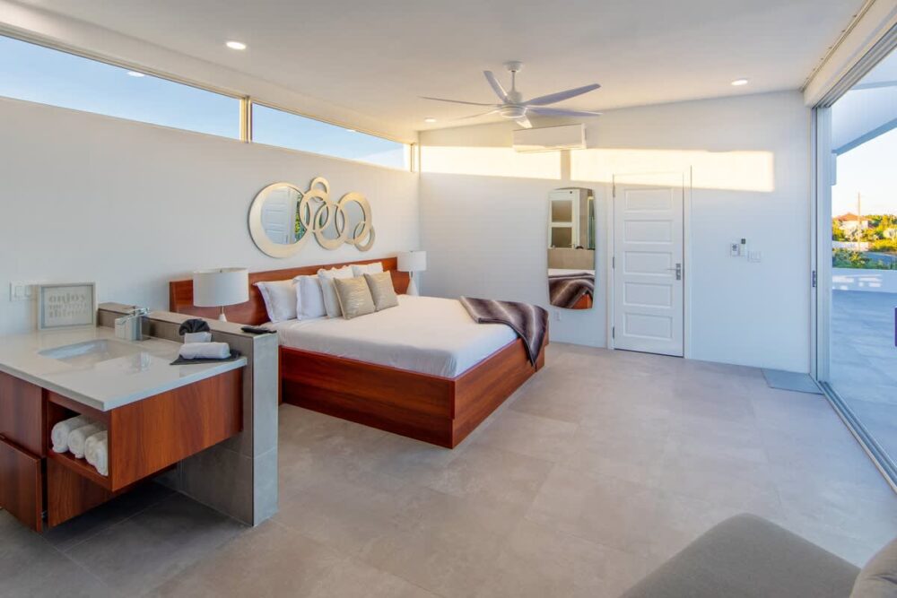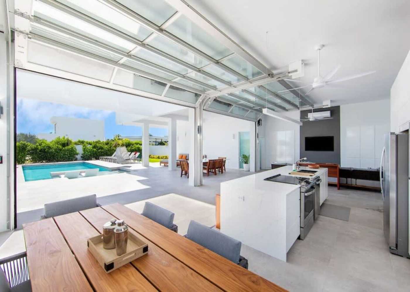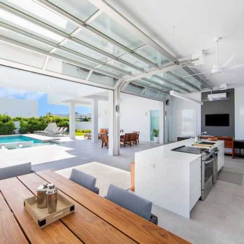 One of the villa’s most unique architectural features is its custom-designed garage-style glass doors. These doors open completely with no track on the floor, creating a true indoor-outdoor living experience. It's a seamless transition from your living room to the pool terrace — making the entire space feel expansive and perfectly integrated with nature. This feature is one-of-a-kind on the island, and it’s one that guests often mention as a highlight of their stay.