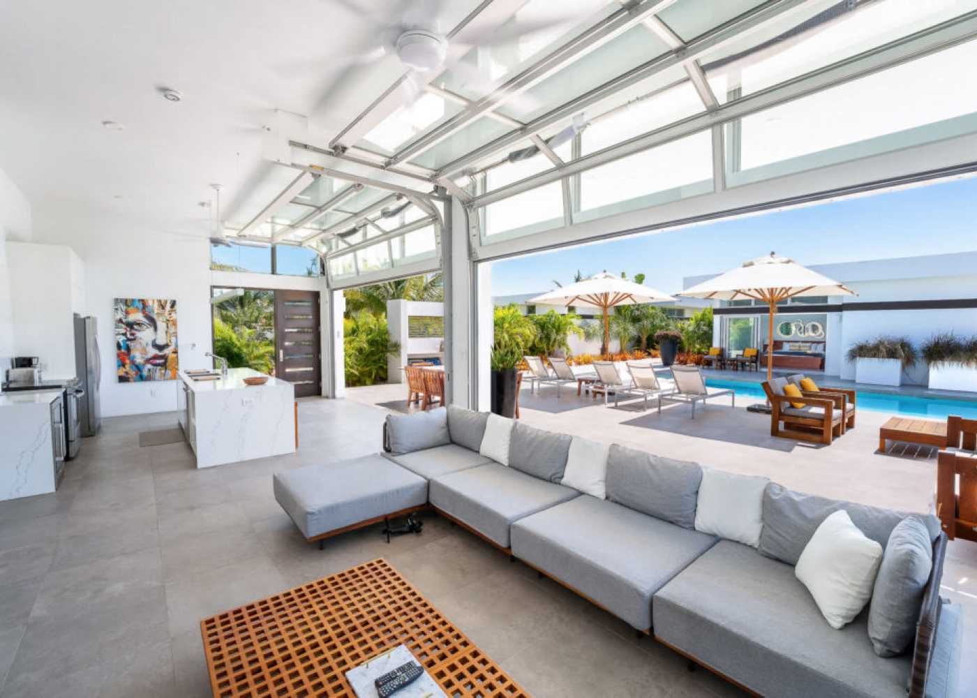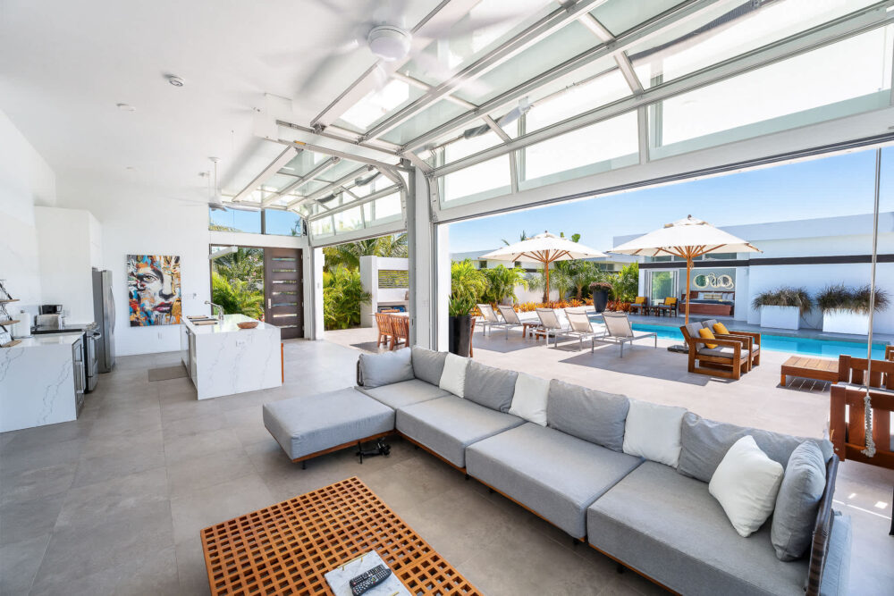 One of the villa’s most unique architectural features is its custom-designed garage-style glass doors. These doors open completely with no track on the floor, creating a true indoor-outdoor living experience. It's a seamless transition from your living room to the pool terrace — making the entire space feel expansive and perfectly integrated with nature. This feature is one-of-a-kind on the island, and it’s one that guests often mention as a highlight of their stay.